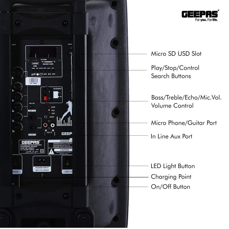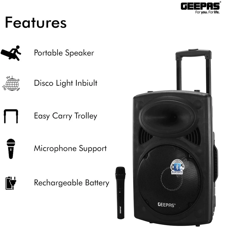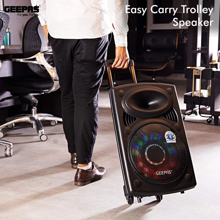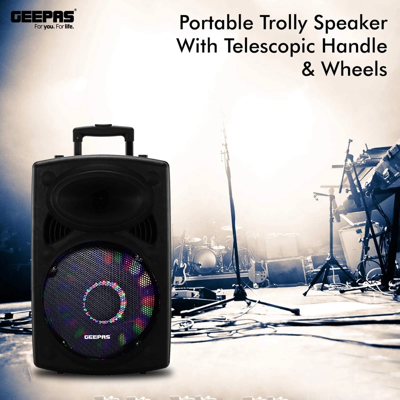 اسپیکر Geepas GMS-8519 با ووفر ۱۲ اینچ، توان ۴۰۰۰۰ وات PMPO، میکروفون بیسیم، نور LED دیسکو، ورودی USB/SD/FM، طراحی ترولی؛ همراه عالی برای مهمانیها، سفر و کارائوکه.