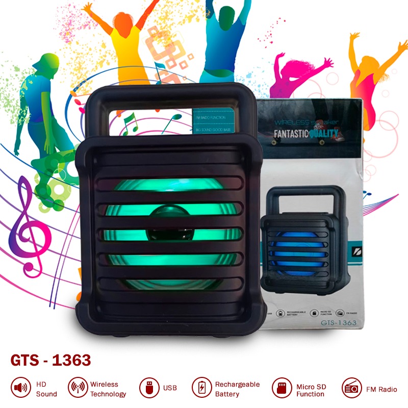 اسپیکر Greatnice GTS-1363 با توان خروجی ۱۰ وات، باتری ۱۲۰۰mAh، پورت USB/SD/TF، رادیو FM، بلوتوث با برد ۱۰ متر و نور LED؛ گزینهای عالی برای صدای همراه در سفر، مهمانی یا فضای بیرونی.