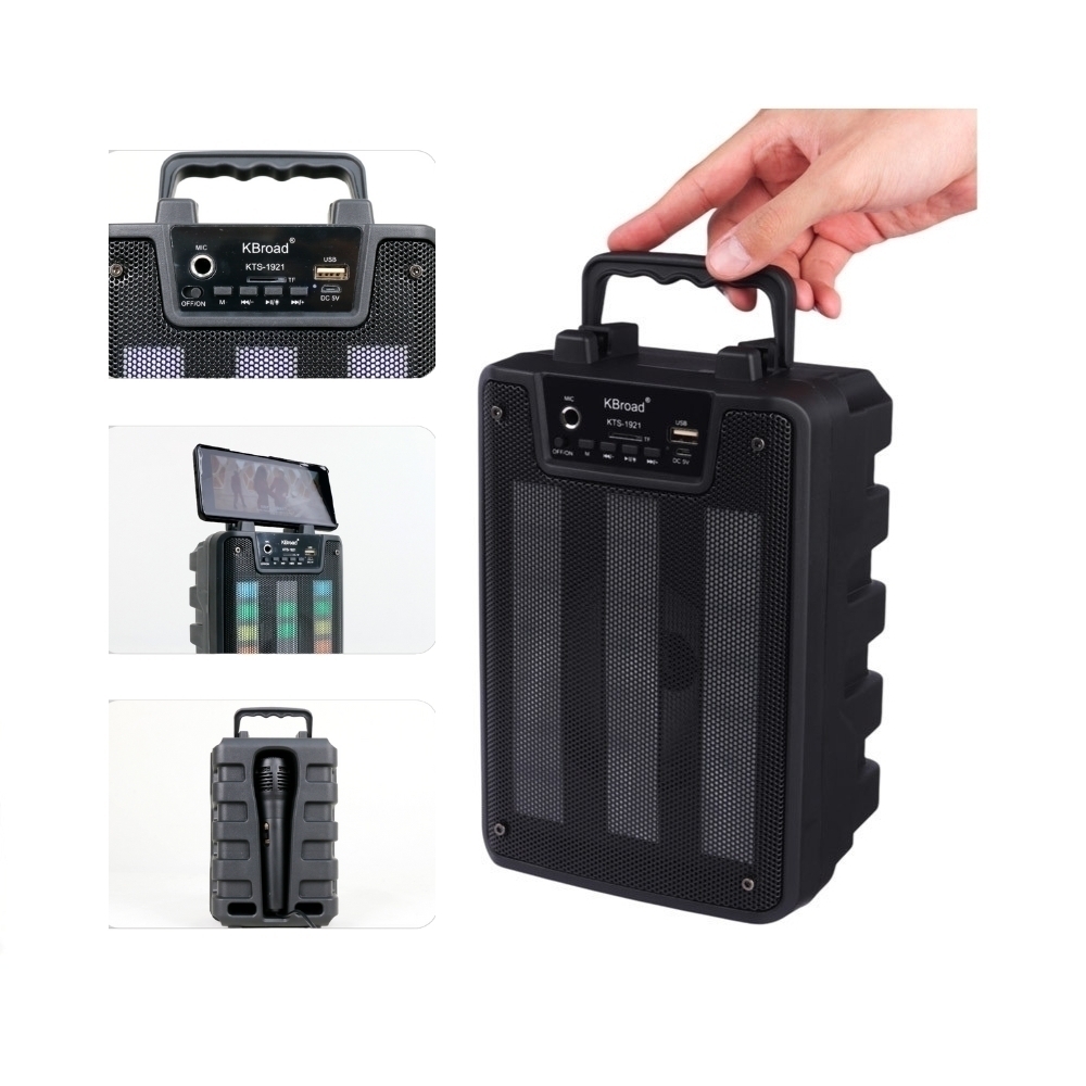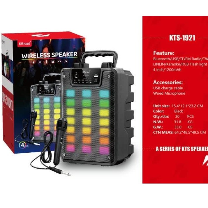 اسپیکر KTS-1921 یک گزینه عالی برای کسانی است که دنبال ترکیب صدای مناسب، امکانات کامل و جلوۀ بصری رنگی هستند. بدنهای متوسط با بلندگوی 4 اینچ و توان 5 وات صدای قابل توجهی در فضاهای متوسط ارائه میدهد — مناسب برای مهمانیهای کوچک، اتاق پذیرایی یا حتی فضای باز ملایم.