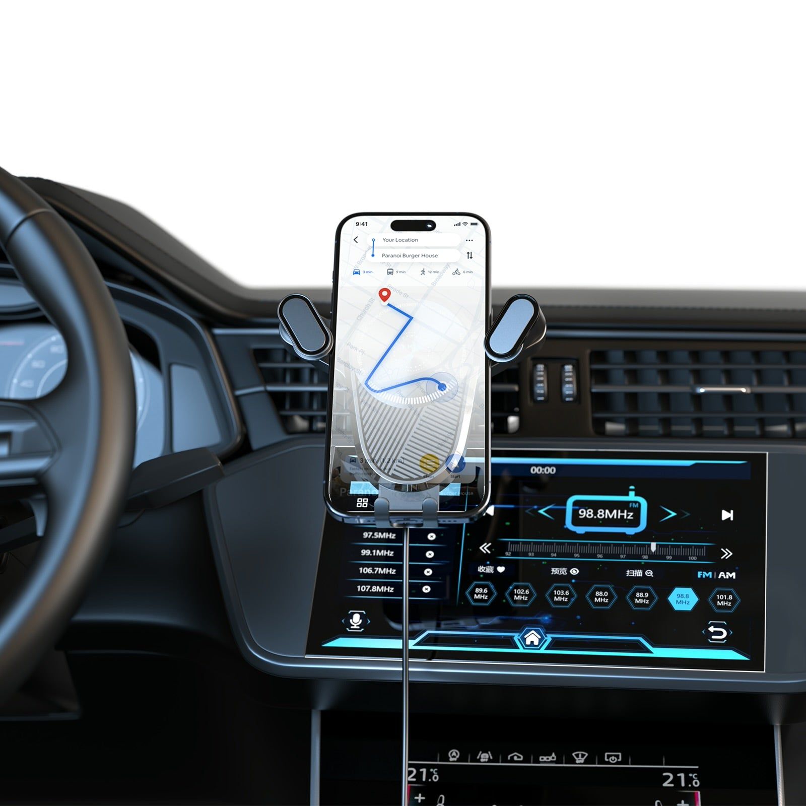 مکانیزم Auto-clamping به معنی این است که فقط با نزدیک کردن گوشی به هولدر، گیرهها بهصورت خودکار بسته میشوند و گوشی را محکم نگه میدارند. پشتیبانی از شارژ بیسیم Qi تا 15 وات باعث میشود در حین مسیریابی یا تماسهای هندزفری، گوشی بهصورت ایمن شارژ شود بدون نیاز به کابلهای مزاحم.