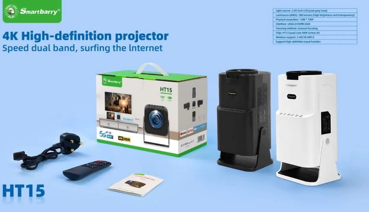 پروژکتور Smartbarry HT15 ترکیبی از عملکرد تصویری مدرن و امکانات هوشمند رو به همراه داره. با پشتیبانی از Full HD و ورودی 4K، استریم بیسیم، بلوتوث و قابلیت اجرای مستقیم اپلیکیشنها، میتونی سینمای خانگی خودت رو در اتاق یا فضای باز داشته باشی.