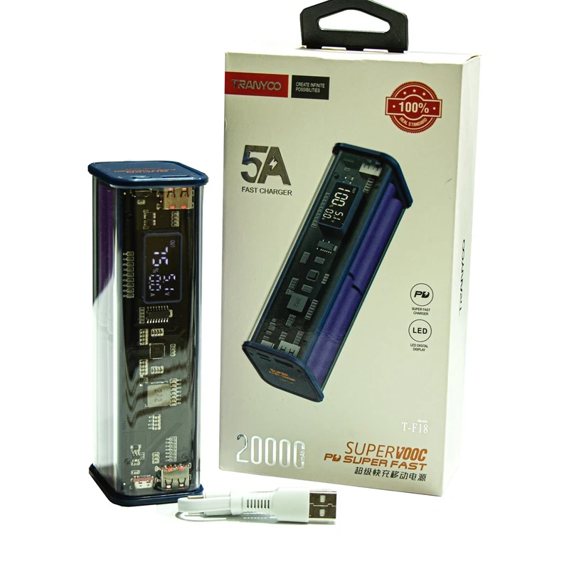 پاوربانک Tranyoo مدل T-F18 با ظرفیت ۲۰٬۰۰۰mAh، پشتیبانی از PD/QC و صفحه نمایش LED وضعیت شارژ؛ همراهی مطمئن برای گوشیها و تبلتها، در سفر یا استفاده روزمره با بدنه آلومینیومی و طراحی شیک.